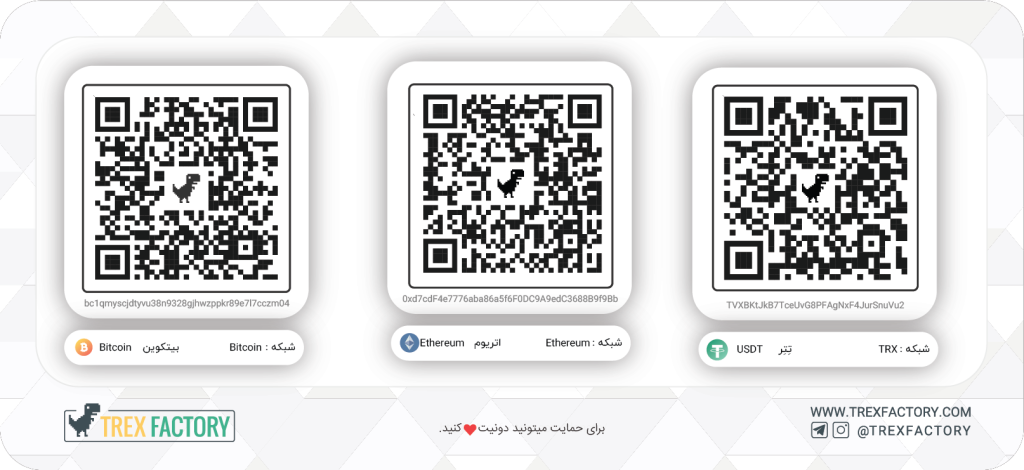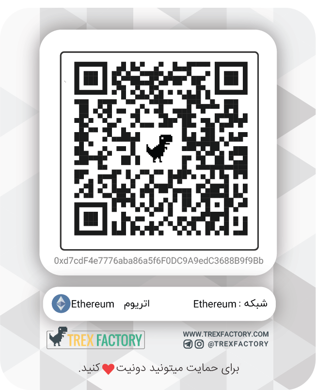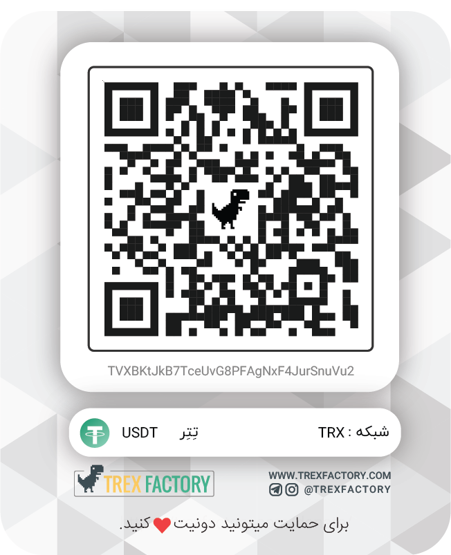 2020-2022 © حقوق متون فارسی، تصاویر و طرح قالب برای سایت TrexFactory و حقوق سایر محتوا برای پدیدآورنده آن محفوظ هست. شما می توانید از محتوای تیرکس فکتوری، در صورت ذکر منبع استفاده نمایید، همچنین در صورت رضایت از خدمات سایت، ما را حمایت کنید Donate - حمایت
